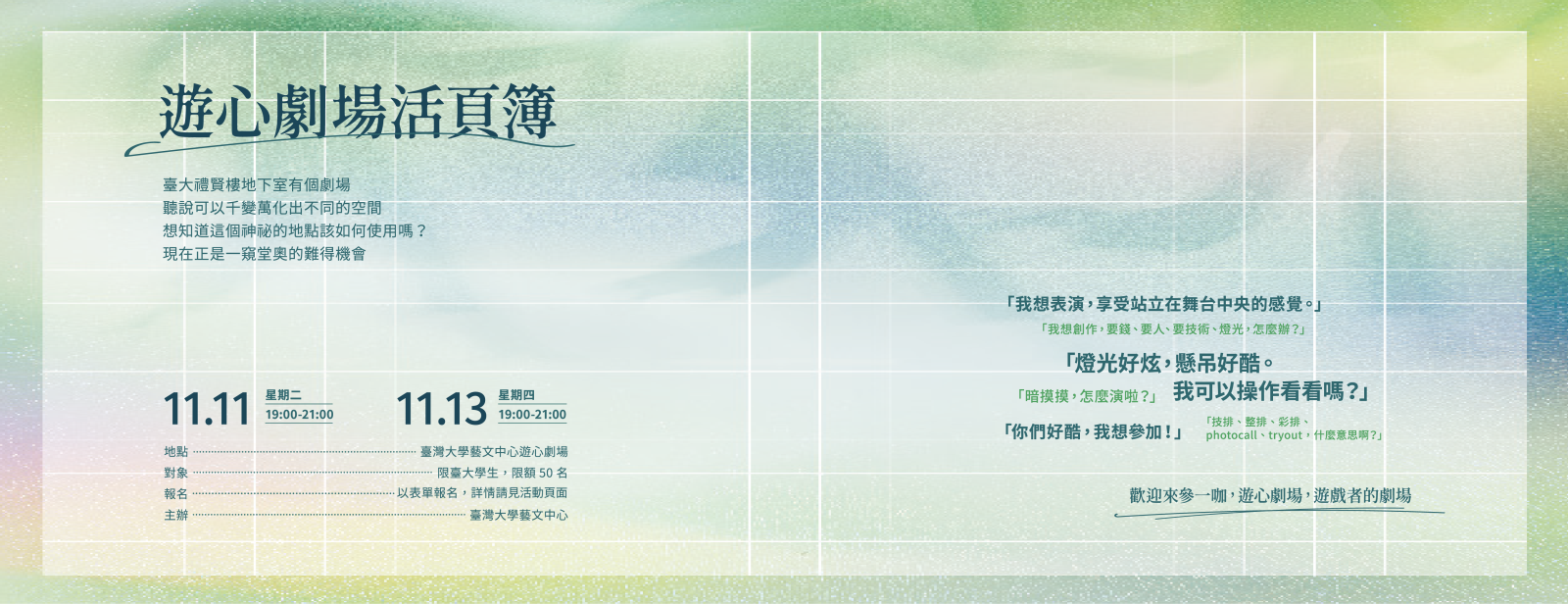 時間|2025/11/11(二)19:00 - 21:00 ;11/13(四)19:00 - 21:00 地點|國立臺灣大學藝文中心遊心劇場 對象|限臺大學生,限額50名 報名|報名連結